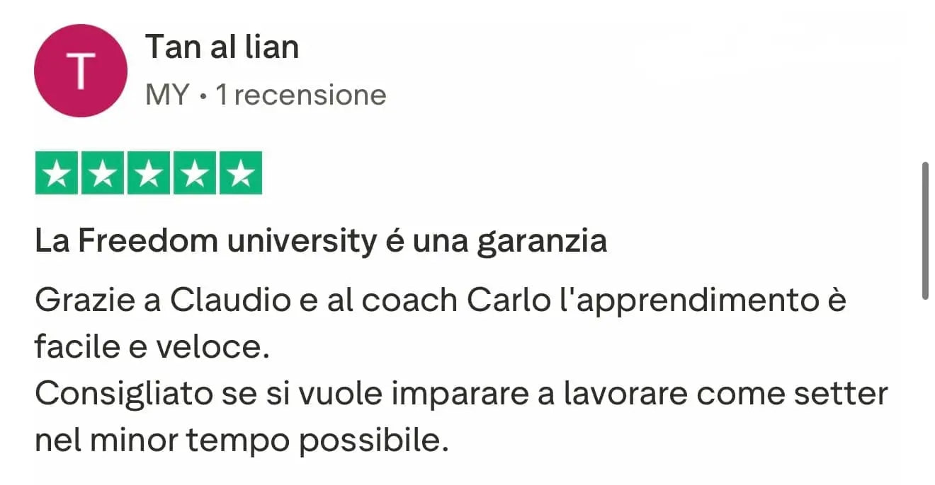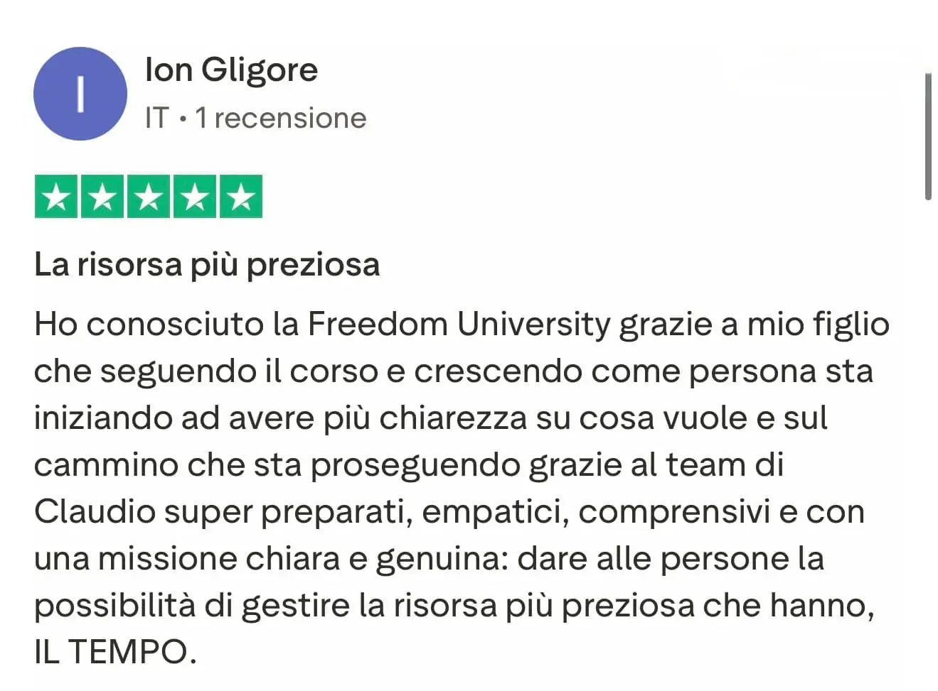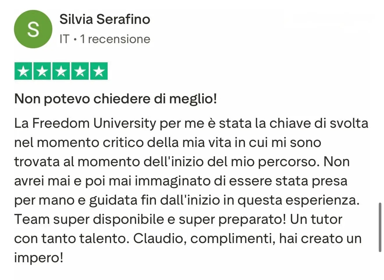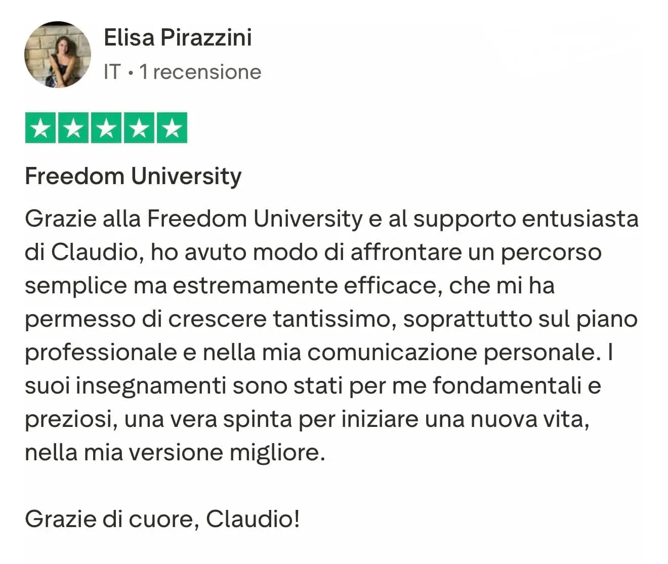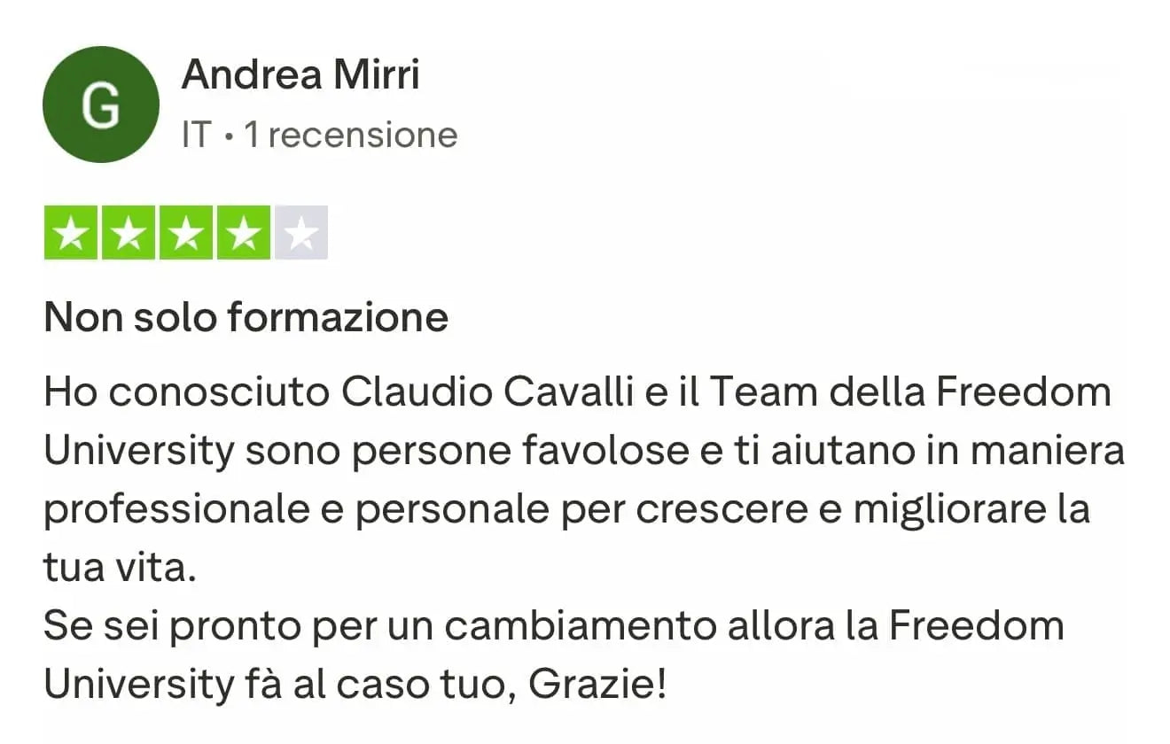 Freedom University e Claudio Cavalli non promuovono metodi per arricchirsi velocemente. Crediamo nel lavoro costante, nella formazione di valore e nell’aiutare le persone a costruire risultati reali, passo dopo passo.